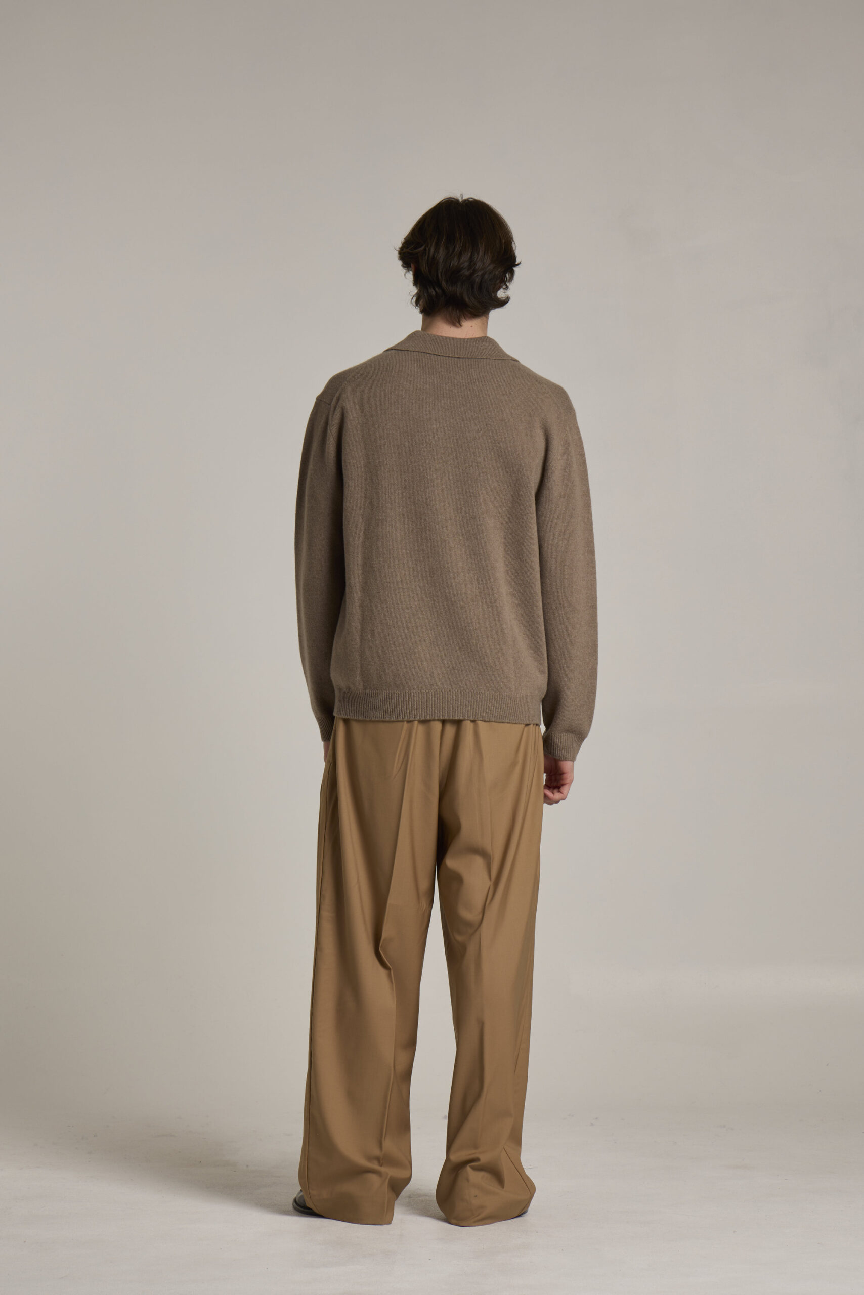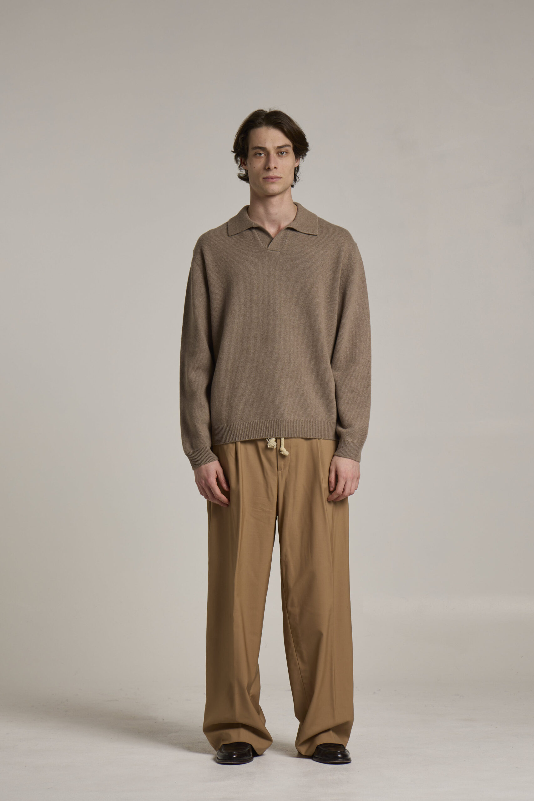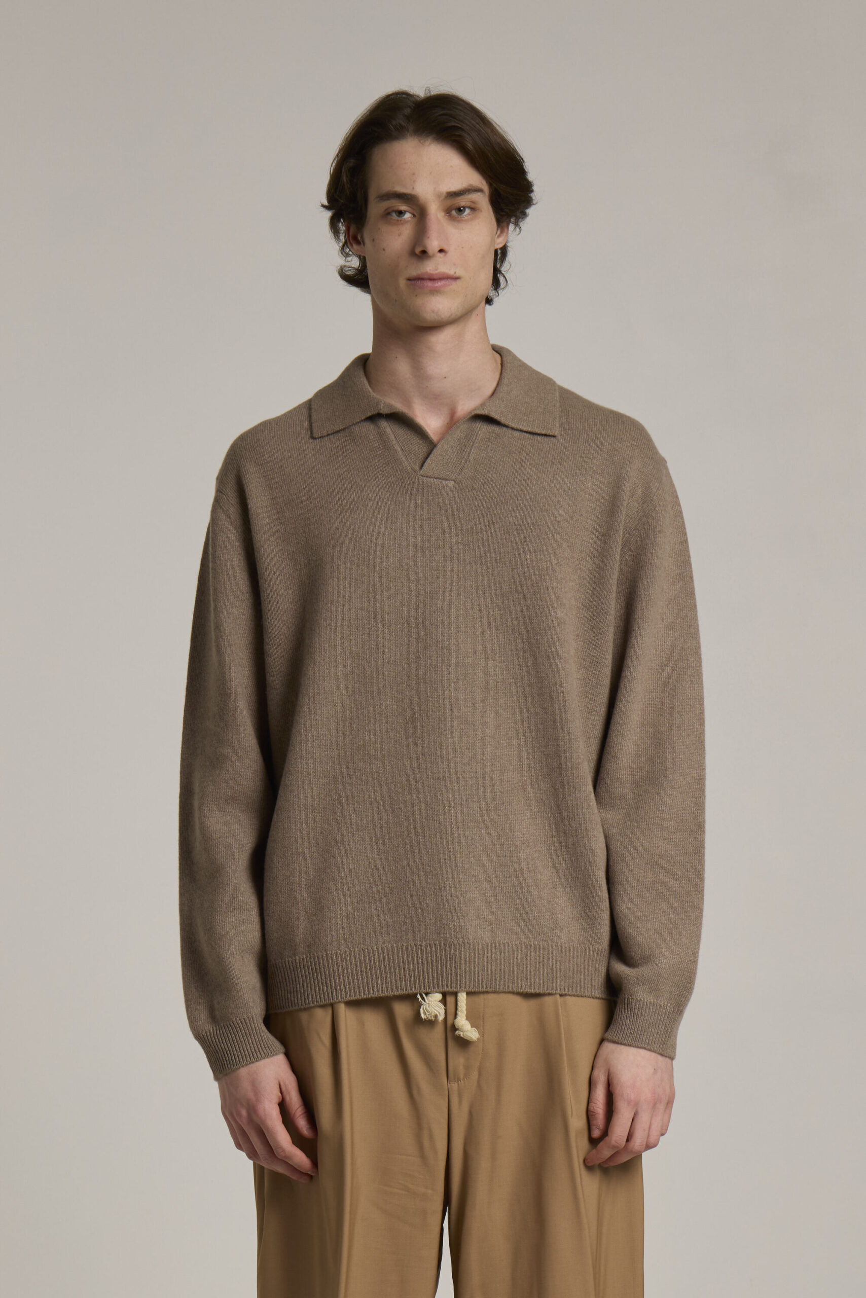 Polo without buttons, garment in 90% extrafine Merino wool and 10% cashmere, with ribbed flounce on bottom and cuffs, yarn dyed, single jersey, relaxed fit, G10