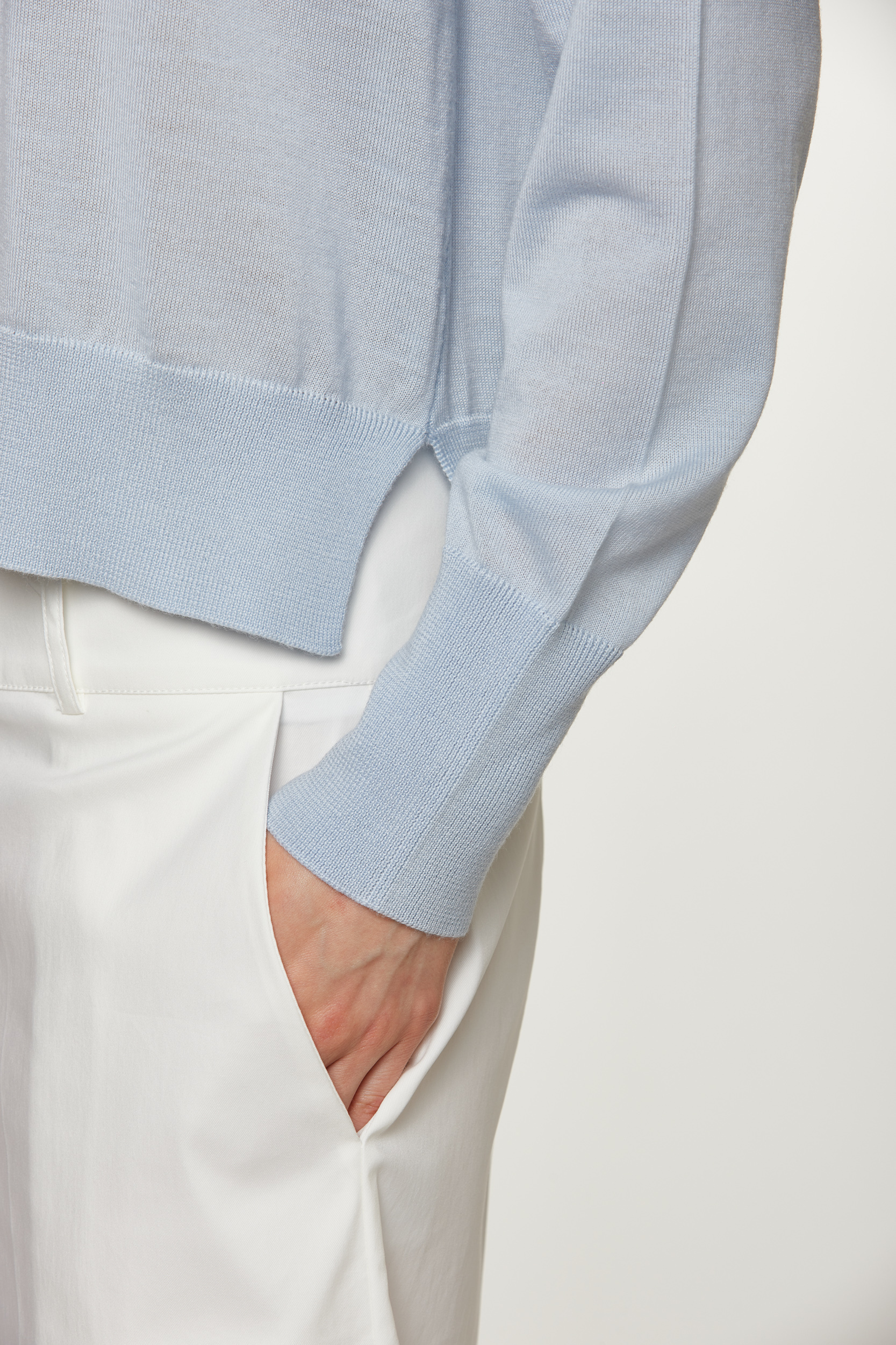 Paricollo asimmetrico con spacchi sui fianchi, capo in 100% extrafine merino wool, con balze a coste su fondo e polsi, rasato, tinto filo, regular fit, F14