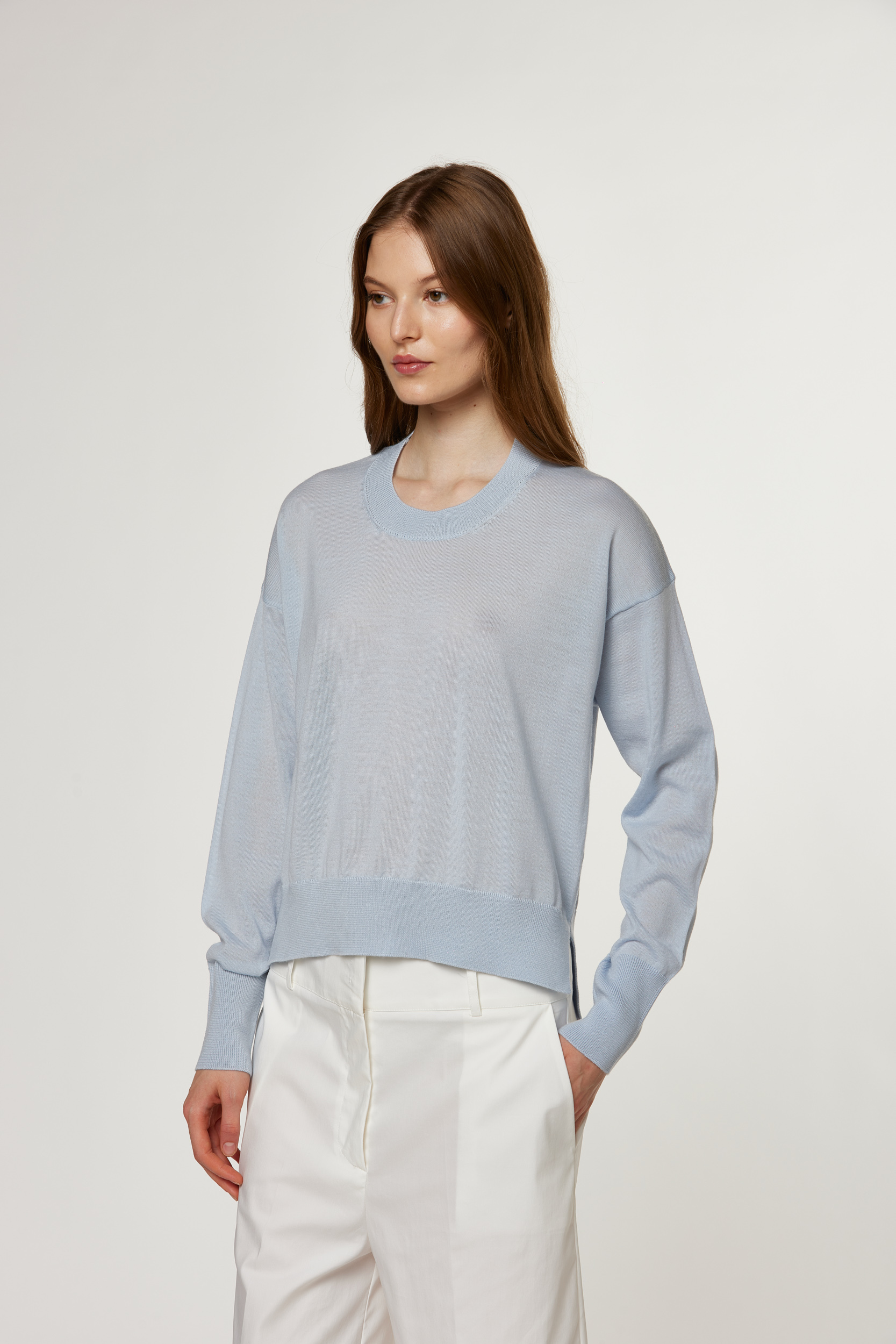 Crew neck, single jersey, 100% extrafine merino wool, garment dyed