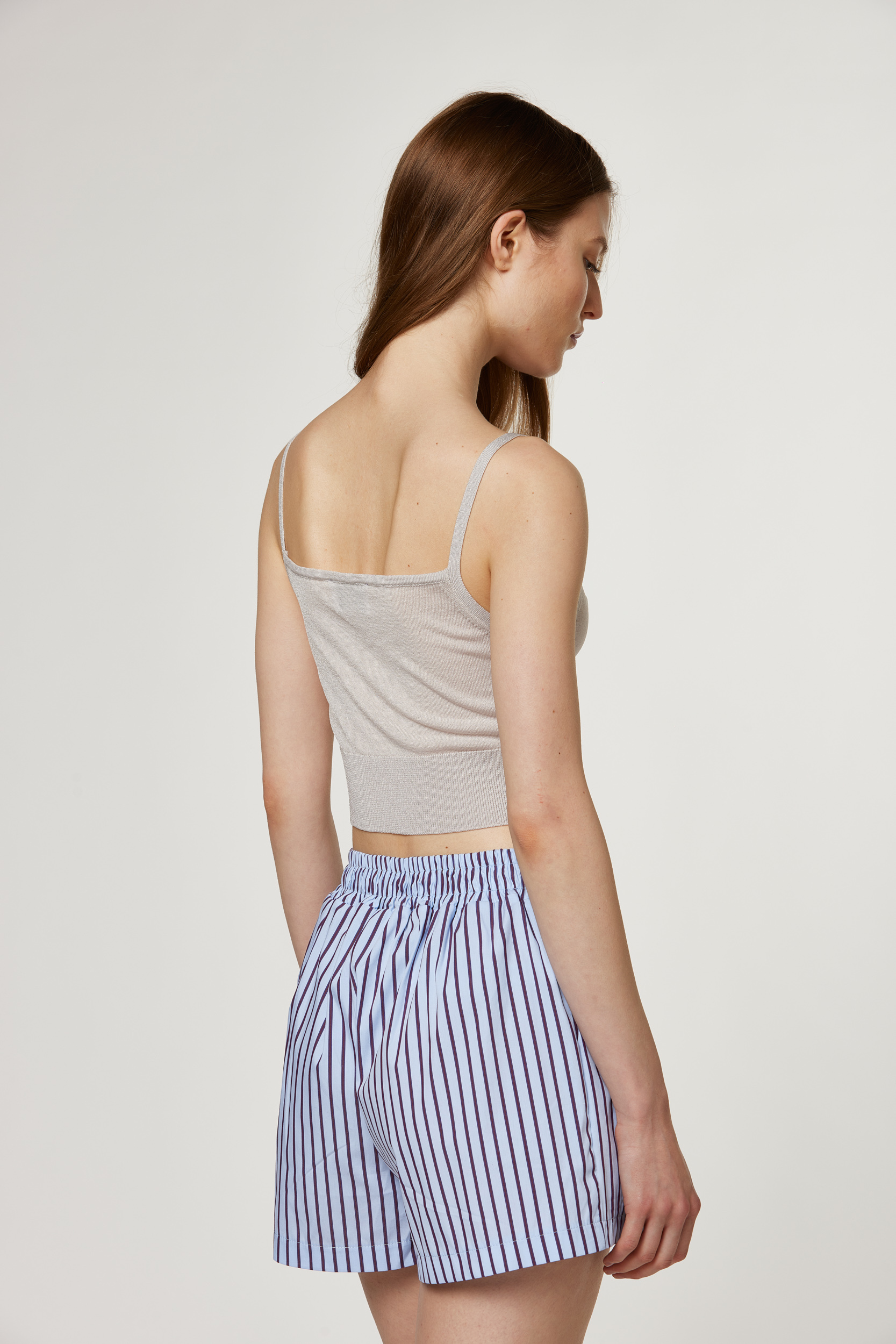 Top con spallini sottili, capo in 80% viscosa, 20% nylon comf., con balze a coste su fondo, rasato, tinto filo, cropped fit F12/14