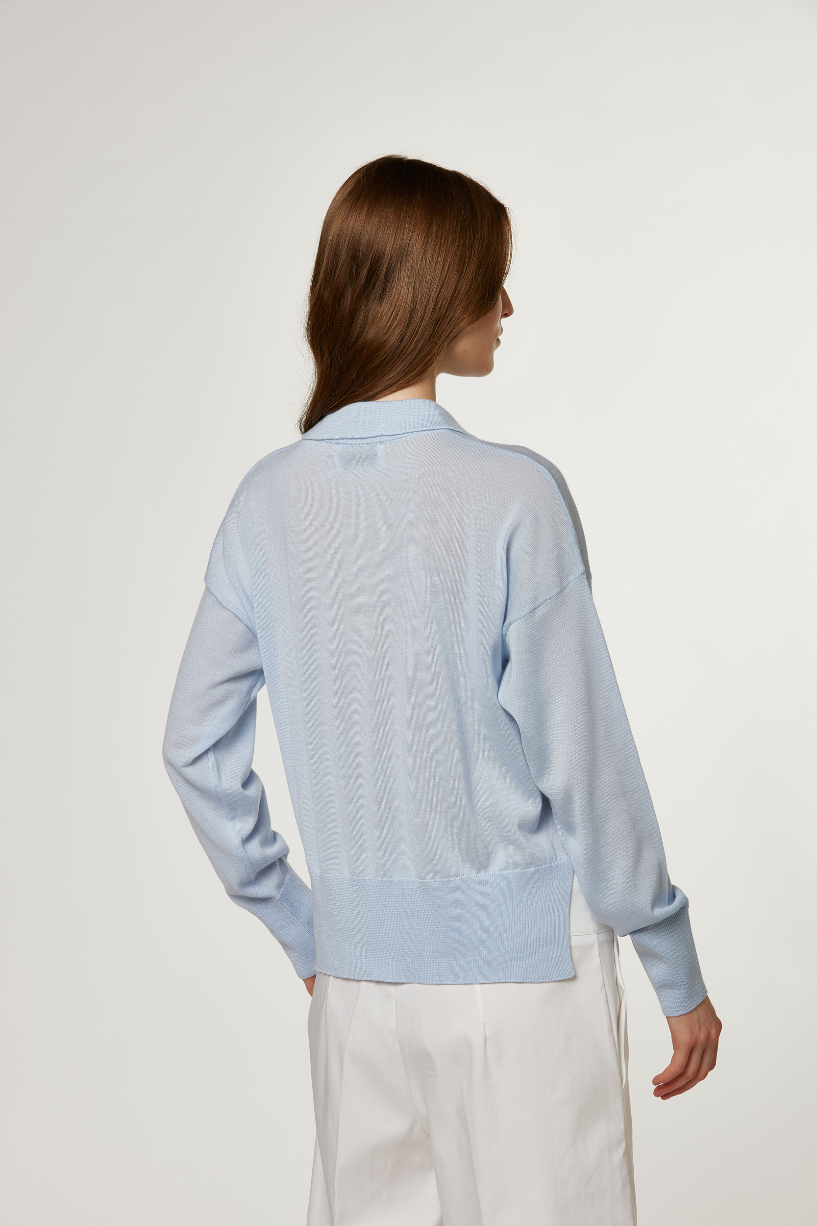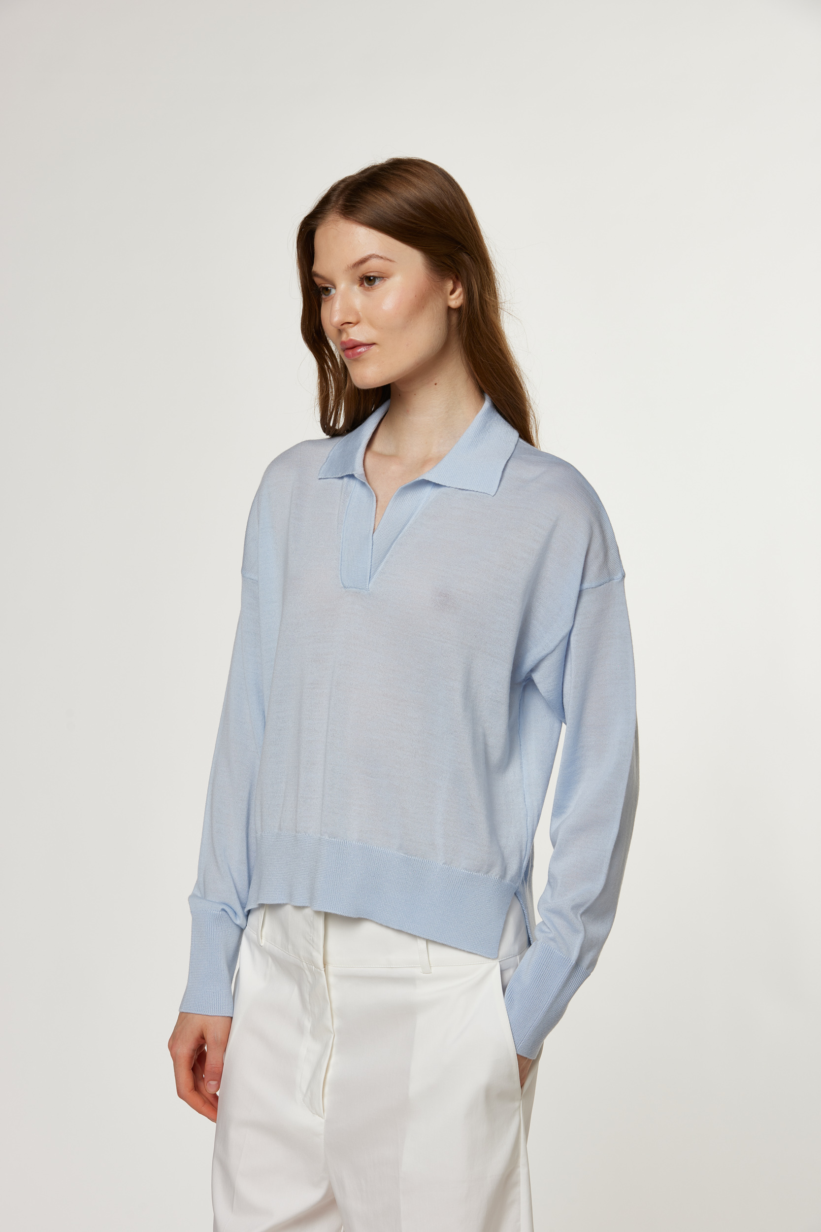 Polo senza bottoni asimmetrico con spacchi sui fianchi, capo in 100% extrafine merino wool, con balze a coste su fondo e polsi, rasato, tinto filo, regular fit, F14